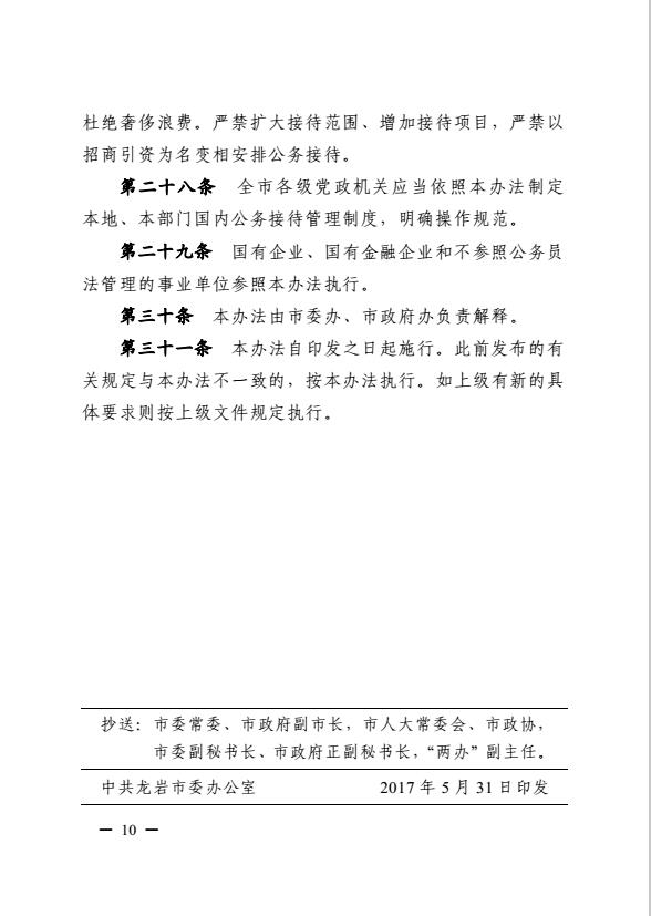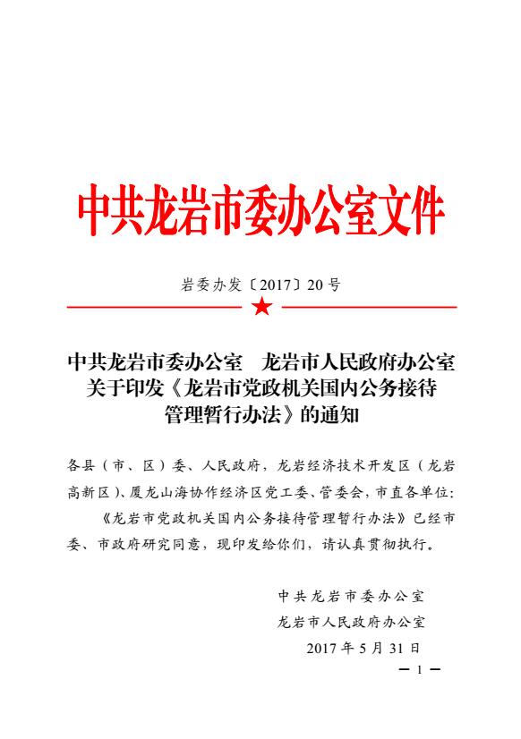 市委辦、市政府辦關(guān)于印發(fā)《龍巖市黨政機(jī)關(guān)國內(nèi)公務(wù)接待管理暫行辦法》的通知(巖委辦發(fā)【2017】20號)