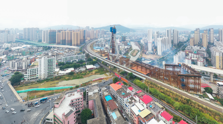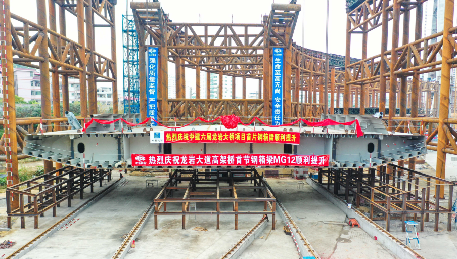 2019年12月31日上午9:28,龍巖大橋主橋首片鋼箱梁開(kāi)始吊裝,標(biāo)志著龍巖大橋主橋正式進(jìn)入鋼箱梁施工階段。首片鋼箱梁提升、滑移、頂推共歷時(shí)約8小時(shí)完成,整個(gè)主橋結(jié)構(gòu)共有26片鋼箱梁。